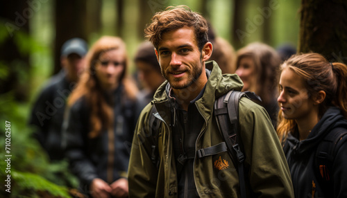 © Jemastock, Fototapeta premium Smiling men and women hiking in nature generated by AI