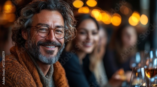 Obraz premium Smiling Middle-Aged Man with Glasses and Friends in a Warm Setting....