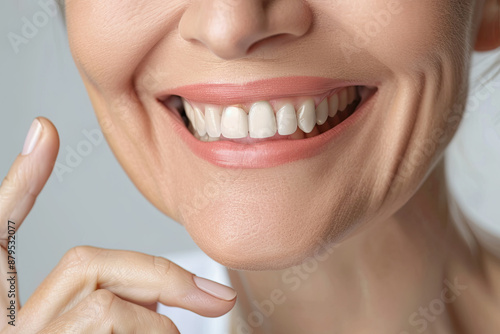 © Yevhen, Obraz premium smiling middle aged woman pointing to corner of her mouth, copy space. Dental care. Dentistry concept.