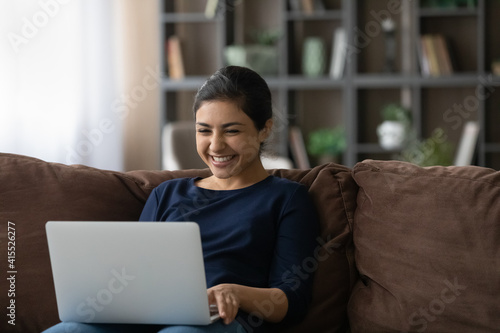 © fizkes, Naklejka premium Smiling millennial Indian woman relax on couch in living room look at laptop screen talk on video call. Happy young mixed race female use computer watch movie, have webcam online virtual conference.