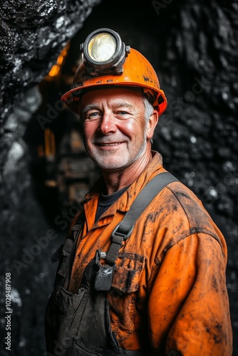 Fototapeta premium Smiling miner wearing an orange helmet and overalls, standing in a dark tunnel