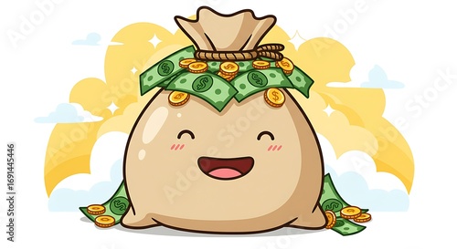 Fototapeta premium Smiling Moneybag: A friendly moneybag brimming with cash and coins smiles...