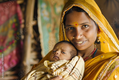 © smth.design, Obraz premium Smiling Mother in Traditional Dress Holding Baby in Vibrant Rural Setting
