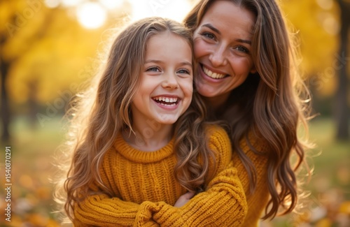 © Pete, Obraz premium Smiling mother with little daughter outdoors in autumn park. Girl with long blond hair hugs mom. Happy family time together. Fall season, leaf, yellow sweaters.