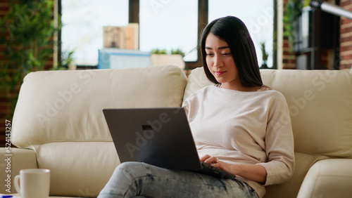 © DC Studio, Naklejka premium Smiling office worker at home working remotely on laptop while sitting on sofa in living room. Young adult person doing remote work on modern portable computer while at home.