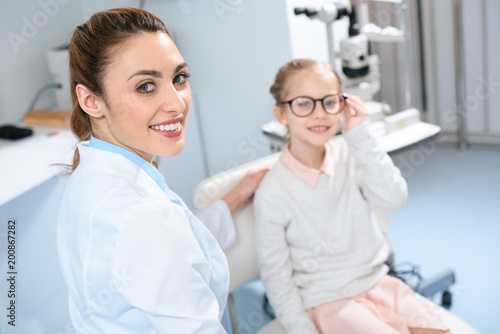 Fototapeta premium smiling ophthalmologist and kid in eyeglasses in optics