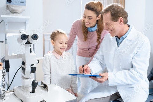 Obraz premium smiling ophthalmologist writing something to patient clipboard in consulting...
