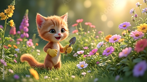 © Urip, Fototapeta premium Smiling Orange Kitten Holding Garden Tool in Colorful Flower Field