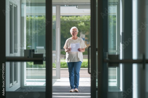 © Maria, Fototapeta premium Smiling patient exits bright hospital lobby into sunlight filled with renewal and quiet optimism