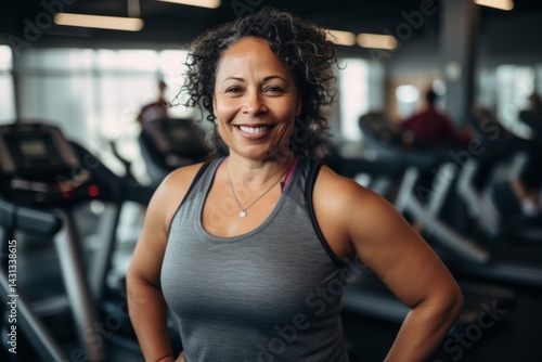 Fototapeta premium Smiling portrait of a middle aged slightly overweight woman in a gym in...