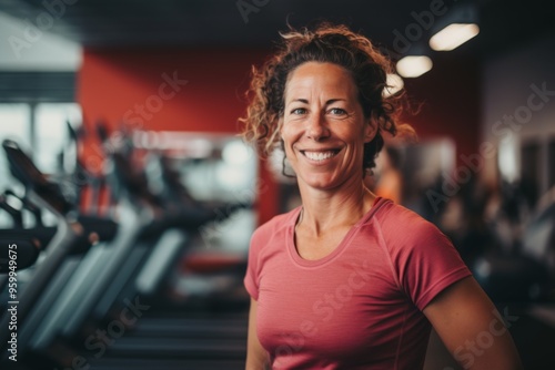 Fototapeta premium Smiling portrait of a middle aged slightly overweight woman in gym