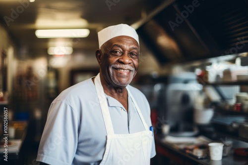 © Vorda Berge, Fototapeta premium Smiling portrait of a senior male chef in professional kitchen