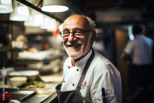 © Vorda Berge, Fototapeta premium Smiling portrait of a senior male chef in professional kitchen