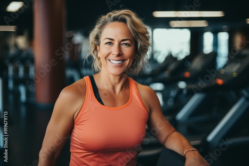 © NikoG, Obraz premium Smiling portrait of a slightly overweight middle aged woman in gym
