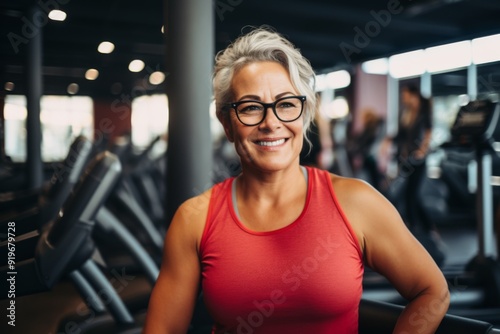 © NikoG, Obraz premium Smiling portrait of a slightly overweight middle aged woman in gym
