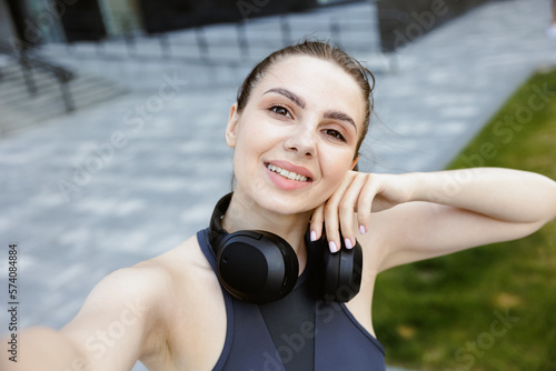 Fototapeta premium Smiling pretty sportswoman taking selfie after workout outdoor.