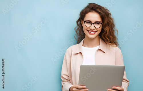 Fototapeta premium Smiling pretty woman with laptop in front of pastel wall created with Generative AI technology