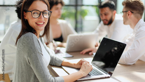 Obraz premium Smiling professional business leaders and employees group team portrait