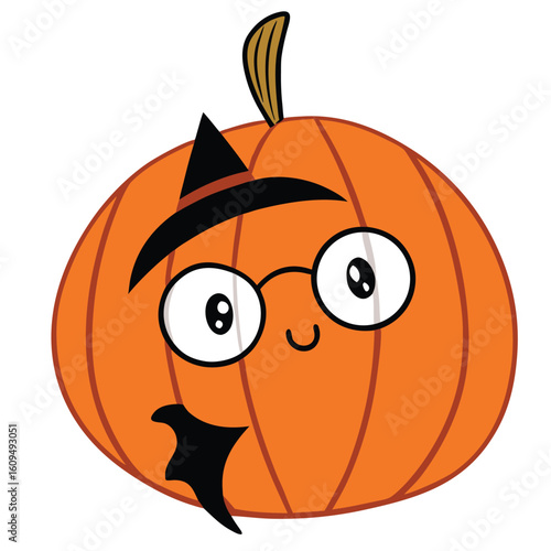 © Mahmuda, Obraz premium Smiling pumpkin wearing witch hat and glasses orange black