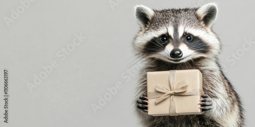 © Maftuh, Fototapeta premium Smiling raccoon holding a beige gift box with a bow against a light gray background