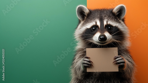 Obraz premium Smiling raccoon on green orange background holds a rectangular piece of paper