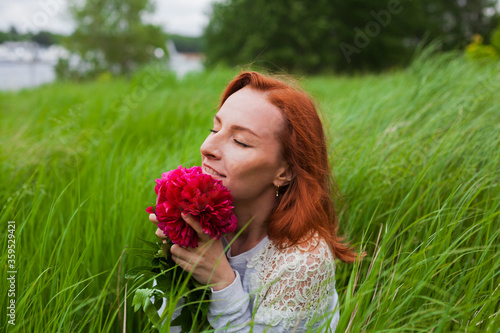 © Alya, Fototapeta premium Smiling redhead girl with peonies in grass. Profile shot