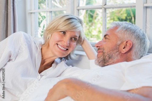 Obraz premium Smiling relaxed mature couple lying in bed at home