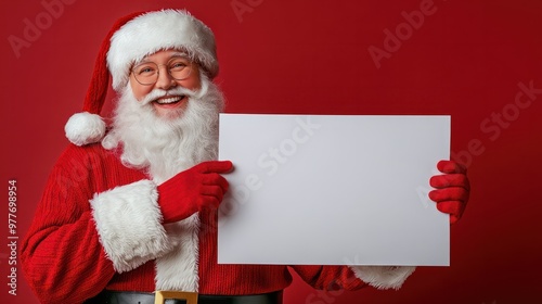 © Johannes, Naklejka premium smiling santa claus holding a blank poster, blank advertising banner background with copy space