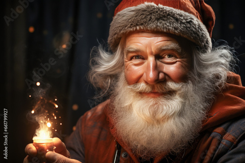 © Jordijm, Obraz premium Smiling Santa Claus offering a magic light in his hands Papa Noel