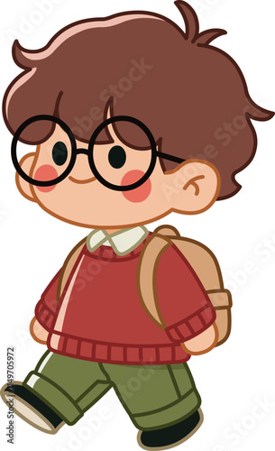© Yael Weiss, Obraz premium Smiling schoolboy walking with backpack in a kawaii cartoon style