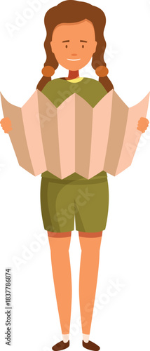 Naklejka premium Smiling scout girl reading a map for orientation during an outdoor excursion, planning route, navigation, and geography concept