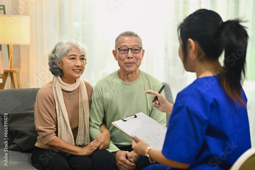 © Prathankarnpap, Fototapeta premium Smiling senior couple listening attentively to nurse or general practitioner explaining therapy details during home visit