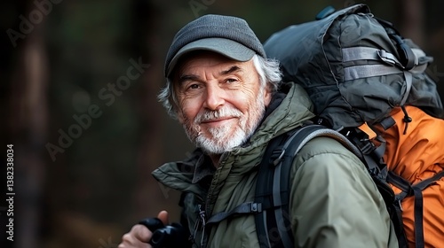 Obraz premium Smiling Senior Hiker in Forest with Autumn Adventure.