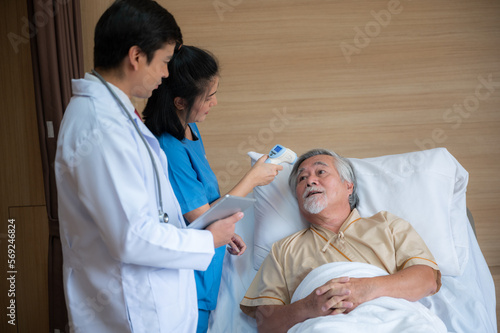 © chokniti, Obraz premium Smiling senior male patient lying and sitting on bed resting while nurse and doctor in lab coat and stethoscope showing digital tablet screen to man in a hospital room