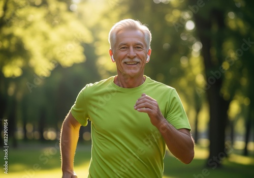 © Meow Creations, Naklejka premium Smiling senior man with grey hair and wireless earbuds enjoying a run in a sunlit park