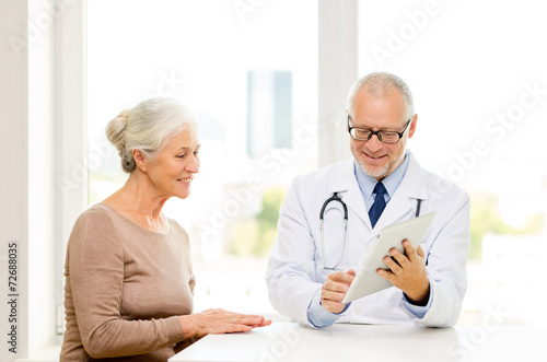 Fototapeta premium smiling senior woman and doctor with tablet pc