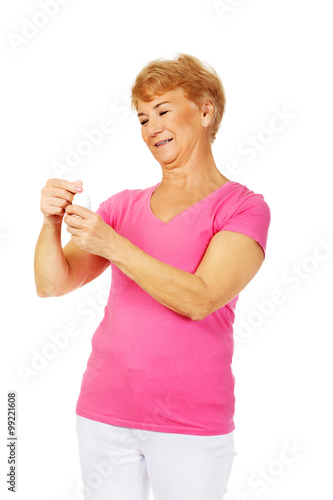 © Piotr Marcinski, Obraz premium Smiling senior woman holding jar of pills