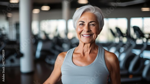 © Charlie, Fototapeta premium Smiling senior woman in a gym very fit fitness for seniors concept
