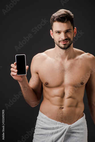 Fototapeta premium smiling sexy man in towel showing smartphone with blank screen isolated on black
