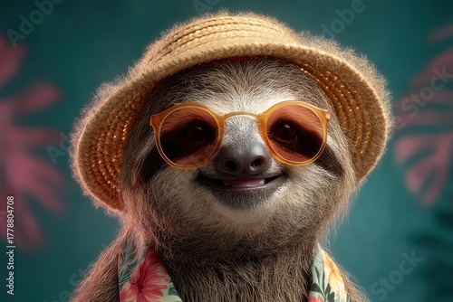 © Ifti Digital, Obraz premium Smiling sloth enjoys summer vibes in a vibrant hat and colorful sunglasses with tropical background