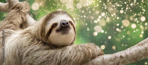 © Mbk, Fototapeta premium Smiling sloth on branch, with blurred bokeh lights behind