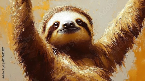 © Ulyana, Obraz premium smiling sloth portrait with raised arms, textured golden brushstrokes and warm orange background conveying joyful serene contentment