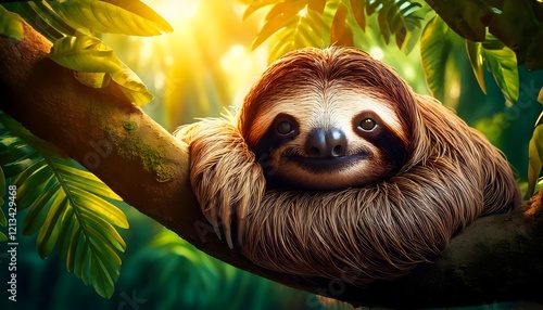 Fototapeta premium Smiling Sloth Resting in a Tropical Forest with Warm Sunlight