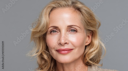 © Johannes, Fototapeta premium smiling sophisticated 50s middle aged blond business woman looking at camera happy mature elegant old lady isolated advertising products or services on grey background headshot close up portrait no l