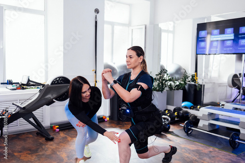 © Dasha Petrenko, Obraz premium Smiling sport girl in ems suit is engaged in physical activity in gym with personal trainer. Young woman with clenched hands doing exercising forward lunges.