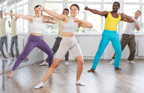 © JackF, Naklejka premium Smiling sporty active young girl enjoying contemporary vigorous dance at group class with men and women of different ages and nationalities in light mirrored studio