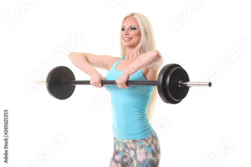 © zhagunov_a, Obraz premium smiling sporty woman exercising with barbell