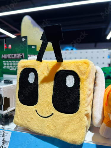 © AS Photo Family, Fototapeta premium Smiling square-shaped stuffed Minecraft character toy on store shelf under bright lighting