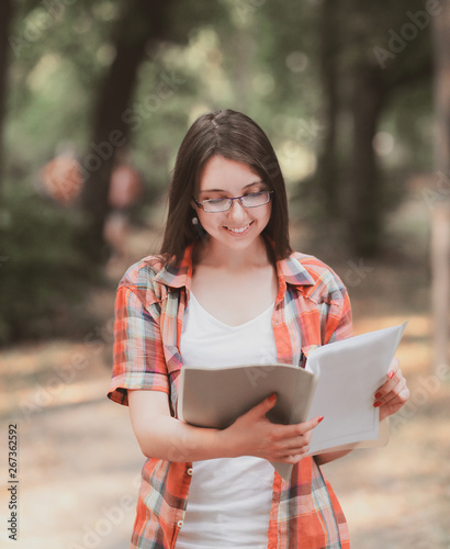 Obraz premium smiling student girl with a clipboard on the background of the Park