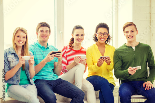 © Syda Productions, Obraz premium smiling students with smartphone texting at school